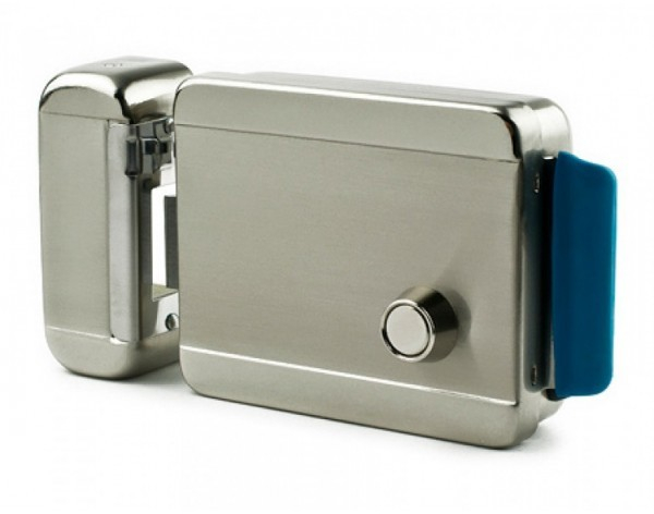 Замок электромеханический, накладной, без блокировки открывания, универсальный - под любой тип двери, DC 12В. Откр. изнутри - кнопка. Цвет - нерж.сталь.