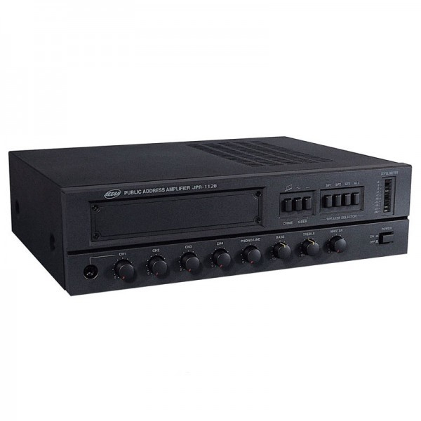 Микшер-усилитель 120 Вт\100В, 5 микр.\лин. + телеф. входов, блок сирен, селектор зон, функция приоритетов, аварийный режим включения, возможность установки CD, тюнера, касс. деки, цифр. блока сообщений, питание 24\220В