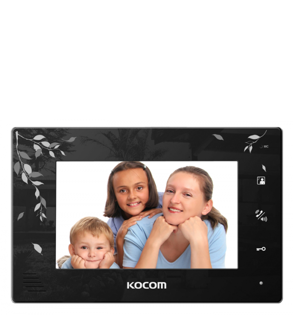 KCV-A374LE (чёрный) - цветной домофон 7дюймов без трубки (Hands Free) с рисунком и глянцевой поверхностью обеспечивает функции наблюдения за посетителями, переговоров и открытия замка, со встроенным интеркомом и блоком питания, совместимость с вызывными панелями JSB, Activision, Ascent, Kenwei и другими.