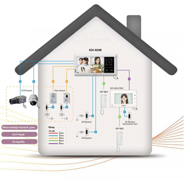 - возможность подключения 4-х вызывных панелей или 4-х камер (вместо вызывных панелей), 2-х аудиотрубок KDP-602G;
