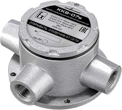 ККВ-07е-Т - коробка коммутационная взрывозащищенная тройниковая предназначена для соединения и разветвления электрических цепей общего и специального назначения (контрольных и силовых кабелей систем автоматики и телемеханики, цепей управления, сигнализации и т.д.) и применяется на предприятиях химической, нефтегазодобывающей, нефтегазоперерабатывающей отраслей и взрывоопасных зонах других производств.
