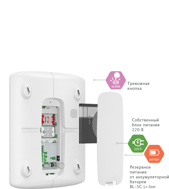 Имеет встроенный GSM-модуль с внутренней антенной с возможностью установки двух SIM-карт для передачи сообщений на пульт охранного предприятия или телефоны ответственных лиц.