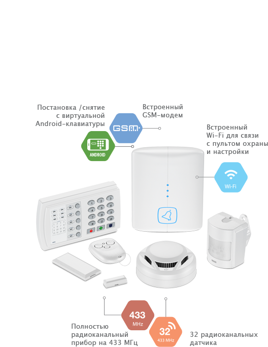 Не требует монтажа проводных коммуникаций для подключения датчиков, клавиатур и сирен.