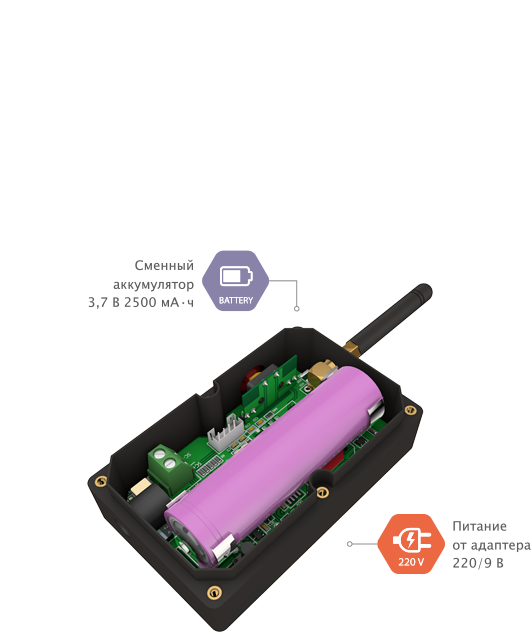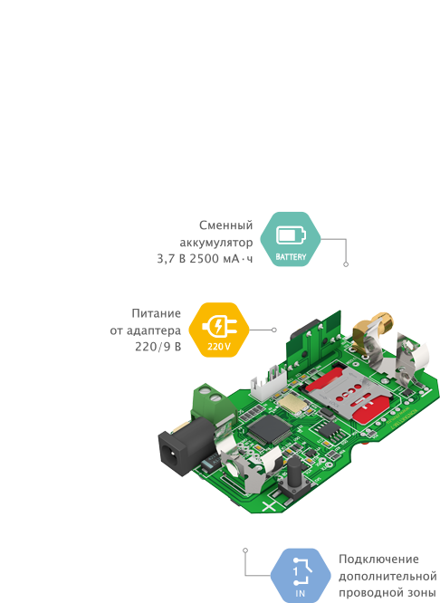 Кнопка питается от аккумуляторной батареи ёмкостью 2500 мА·ч, что обеспечивает работу в режиме On-line (постоянная связь с мониторинговой системой) на протяжении до 2 суток без подзарадки.