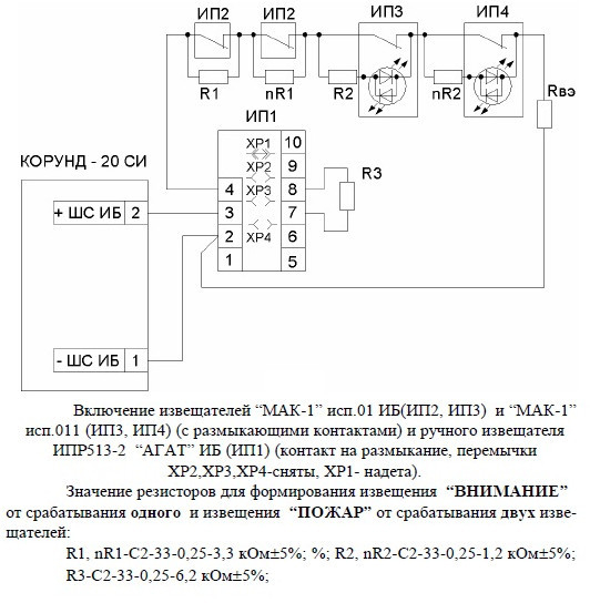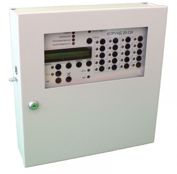 Корунд 20-СИ (10 шл.) исп.01 - прибор приёмно-контрольный искробезопасный охранно-пожарный на 10 ШС, взрывозащищённый (ExiаIIC), степенью защиты (IP20), напряжением питания (187 - 242 или 10,8 - 15 В), наличием: контроля целостности цепи, отсека резервного питания (АКБ 1х7Ач - приобретается отдельно), настенный предназначен для приема сигналов, поступающих от датчиков с наличием искробезопасности, установленных в помещениях с взрывоопасной средой (все классы), с последующей трансляцией извещений на ПЦН и формирования импульса для запуска систем пожаротушения, дымоудаления, оповещения и эвакуации людей при пожаре, управлением внешними звуковыми и/или световыми оповещателями.
