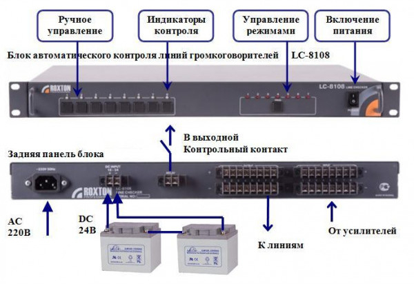ROXTON LC-8108 - блок автоматического контроля линий оповещения предназначен для контроля исправности до 8-ми линий громкоговорителей.