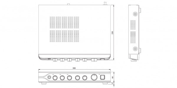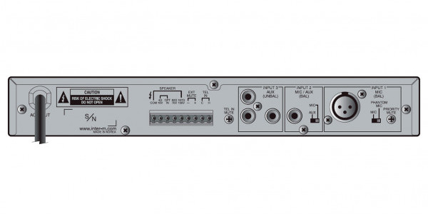 В устройстве предусмотрены приоритетный микрофонный вход, 1 универсальный и 1 линейный вход, линейный вход для подключения АТС, регуляторы уровня громкости для каждого входа и для выхода, 2-полосный эквалайзер.