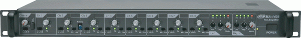 MA-1408 - настольный и встраиваемый в 19" стойку/шкаф 2-зонный предварительный микшер - усилитель с встроенными: 2-х полосным эквалайзером (для каждого канала), генератором сигнала "Гонг" предназначен для микширования и усиления звукового сигнала.