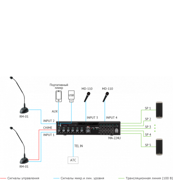 MA-212U - цифровой трансляционный 5-зонный усилитель выходной мощностью 120 Вт предназначен для усиления звукового сигнала с целью его дальнейшей трансляции на громкоговорители 4 Ом или с питанием 100 В.