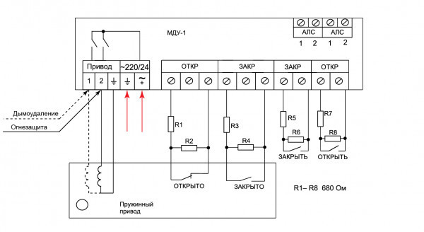 МДУ-1С прот. R3 - модуль управления клапаном огнезадерживающим или дымоудаления и предназначен для их управления в ручном режиме с кнопочного поста или в автоматическом режиме с приемно-контрольного прибора.