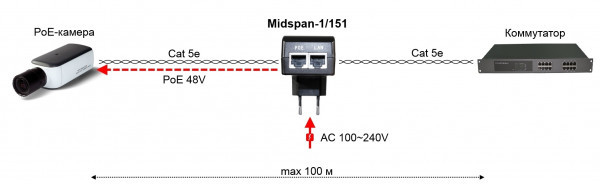 Midspan-1/151G - PoE-инжектор Gigabit Ethernet на 1 порт питания мощностью до 15,4Вт не требует монтажа, устанавливается в электрическую розетку.