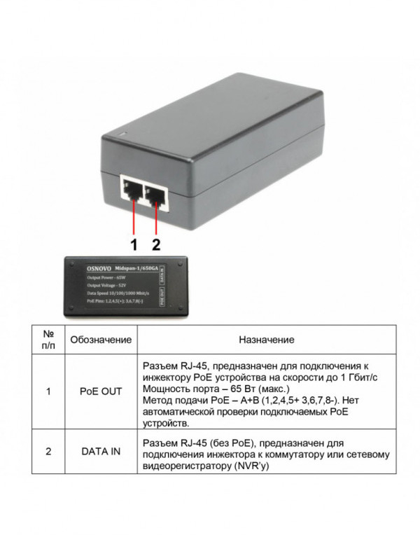 Назначение: устройство предназначенное для подачи питания (PoE) на оконечное PoE устройство по кабелю витой пары.