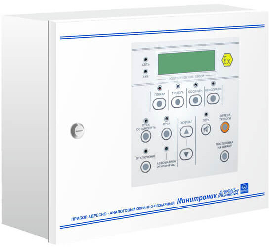 МИНИТРОНИК A32.Ех - прибор адресно-аналоговый приёмно-контрольный охранно-пожарный и управления на 32 ШС (до 128 адресных устройств), взрывозащищённый (ExiallCX), степенью защиты (IP30), напряжением питания (187 - 242 или 9 - 14 В), наличием: контроля целостности цепи, отсека резервного питания (АКБ 1х7Ач - приобретается отдельно), настенный предназначен для приема сигналов, поступающих от датчиков с наличием искробезопасности, установленных в помещениях с взрывоопасной средой (все классы), с последующей трансляцией извещений на ПЦН и формирования импульса для запуска систем пожаротушения, дымоудаления, оповещения и эвакуации людей при пожаре, управлением внешними звуковыми и/или световыми оповещателями.