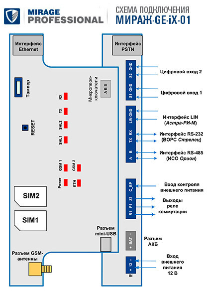 Мираж-GE-iX-01 - контроллер для интеграции с приемно-контрольным оборудованием сторонних производителей, передача извещений по двум беспроводным сетям связи стандарта GSM/GPRS 900/1800.