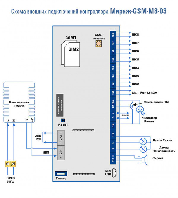 Мираж-GSM-M8-03 - контроллер охранно-пожарного мониторинга предназначен для решения масштабных задач по обеспечению безопасности недвижимости (многоэтажные офисные здания, торговые центры, банки, пультовая охрана частной недвижимости) с передачей извещений на станцию мониторинга.