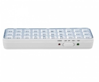 Светильник аварийного освещения светодиодный автономный непостоянного действия, двух режимный. Источник света 30 сверхъярких светодиодов, 187-242В/ 50 Гц, световой поток 80Лм, АКБ Li-ion 3.7v 1000 mAh, время автономной работы 6 часов, защита АКБ от перезаряда и глубокого разряда, габариты 205х58х30 мм, масса 0,13 кг, температура эксплуотации 0С..+40С.