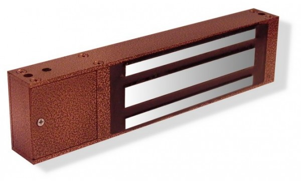 ML ЦИФРАЛ-350 - электромагнитный, антивандальный, коричневого цвета накладной (удерживающий, однодверный) замок с уголком (50х50) в комплекте, с отсеком для установки контроллера, в корпусе из металла, окрашенного порошковым методом, с усилием удержания 350 кг, напряжением питания - (11,4 - 12,6)В, током потребления - 0,6А, диапазоном рабочих температур от -40 до +50оС, с габаритными размерами - 248х60х32мм, массой - 2,7 кг предназначен для запирания всех типов дверей толщиной от 35 до 70мм.