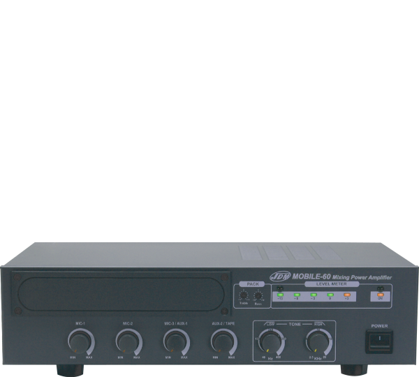 MOBILE-60 - трансляционный настольный и мобильный 1-зонный микшер - усилитель выходной мощностью 60 Вт, встроенным 2-х полосным эквалайзером предназначен для микширования и усиления звукового сигнала с целью его дальнейшей трансляции на громкоговорители 4 - 16 Ом или с питанием 70/100 В.