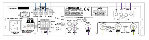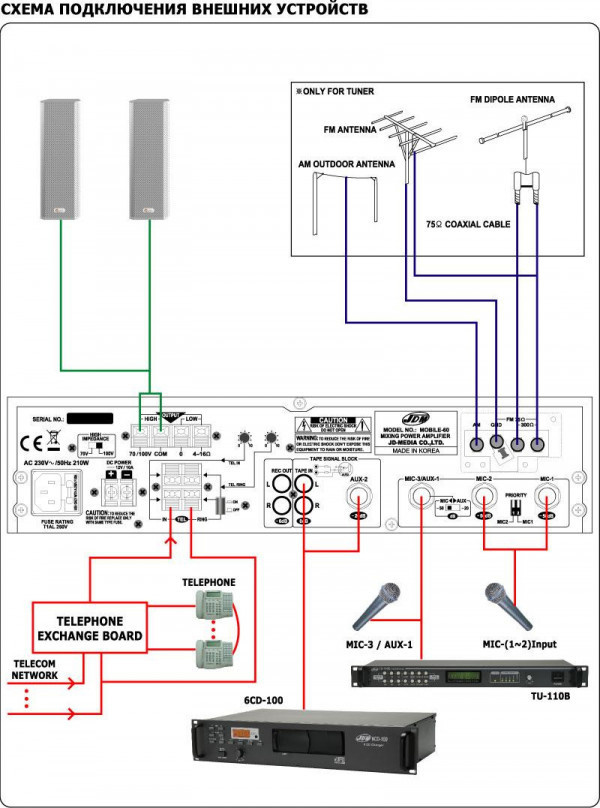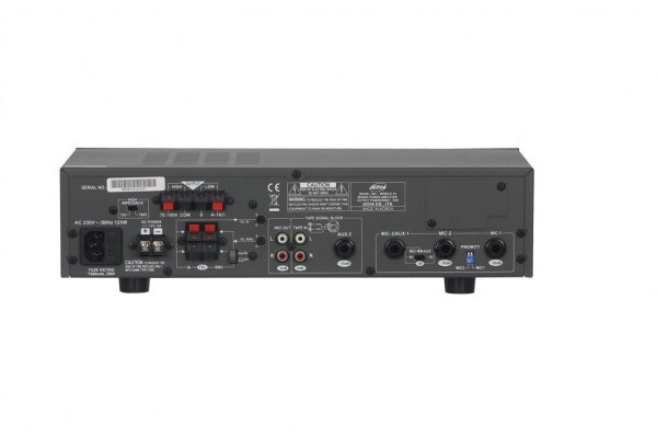 Микшер-усилитель 60 Вт/100 В, 4 микрофонных/линейных + телефонный входа, функция приоритетов, телефонный вызов + ночной режим, вход AMP, PREAMP выход, возможность установки тюнера, кассетной деки или цифрового блока сообщений, 220 В(AC)/12 В(DC), 125 Вт,
