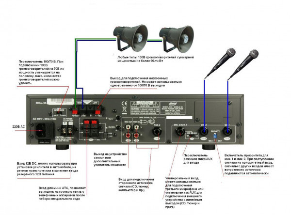 В устройстве предусмотрены приоритетные аудиовходы (микрофонные - 2шт).