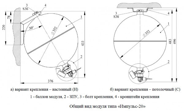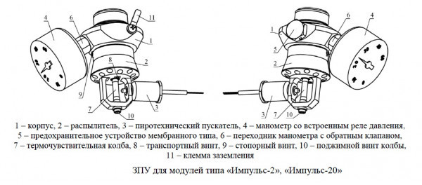 МГП Импульс-20 - модуль газового пожаротушения незаправленный хладоном (125 или 227 - приобретаются отдельно), в нормальном исполнении с температурным диапазоном эксплуатации (от -10 до +50°С), с запорно-пусковым устройством (ЗПУ), оснащённым манометром давления (ЕКМ.60) и распылителем, возможностью приведения в действие: с режимом самозапуска (при достижении определённой температуры срабатывания - 680С) или дистанционным (ручным) запуском, или электрозапуском (через встроенный пиротехнический пускатель - ПТП.Е-1) предназначен для автоматического подавления очагов пожара классов А (твердых веществ), В (жидких веществ), С (газообразных веществ) и Е (электрооборудования, находящегося под напряжением).