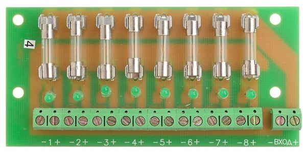 Распределение питания с одного выхода на восемь независимых каналов, каждый из которых снабжён цепями защиты и индикацией наличия выходного напряжения