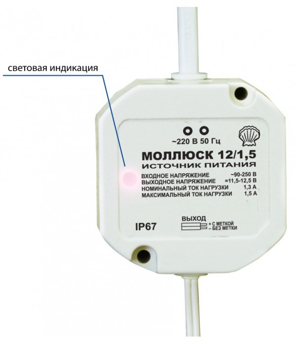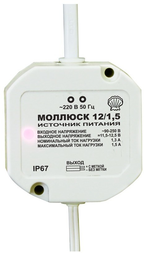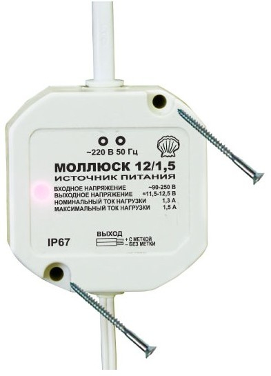 Моллюск-12/1,5 - источник питания предназначен для питания радиоэлектронных устройств широкого применения напряжением 12 В постоянного тока от сети переменного тока напряжением 220 В, защищен от перегрузки и короткого замыкания на выходе, работоспособен на холостом ходу.