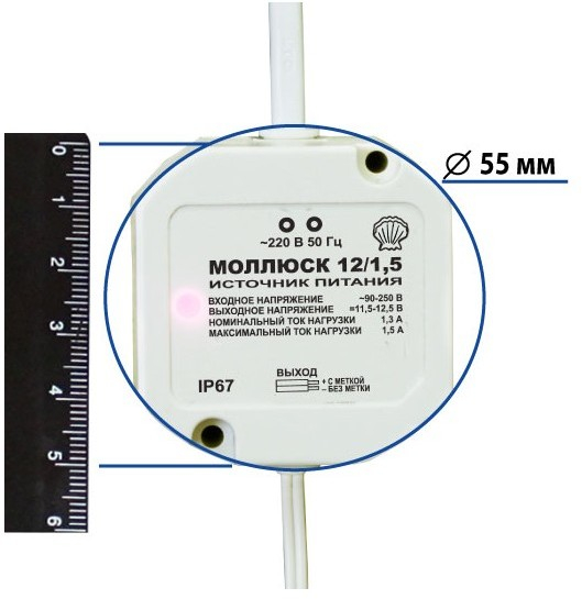 12В, 1,5А. Расширенный сетевой диапазон 90-250В, габариты 50х50х25 мм, скругленные края 55мм, защита выхода от КЗ и перегрузки, прочность изоляции 3 кВ, отверстия для крепления, корпус IP67. Белый корпус, светодиодная индикация.