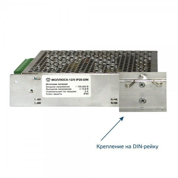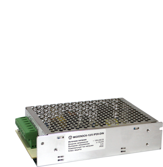 Моллюск-12/5 IP20 DIN - источник питания предназначен для питания радиоэлектронных устройств широкого применения напряжением 12 В постоянного тока от сети переменного тока напряжением 220 В, защищен от перегрузки и короткого замыкания на выходе, работоспособен на холостом ходу.