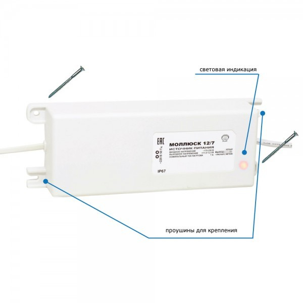 12В, 7А, габариты 205х70х40 мм, защита выхода от КЗ и перегрузки, прочность изоляции 3 кВ, проушины для крепления, корпус IP67