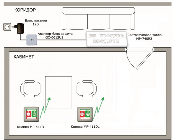 Кнопка вызова устанавливается в кабинете, а световое табло устанавливается в коридоре, где посетители ожидают в очереди приема в кабинет.