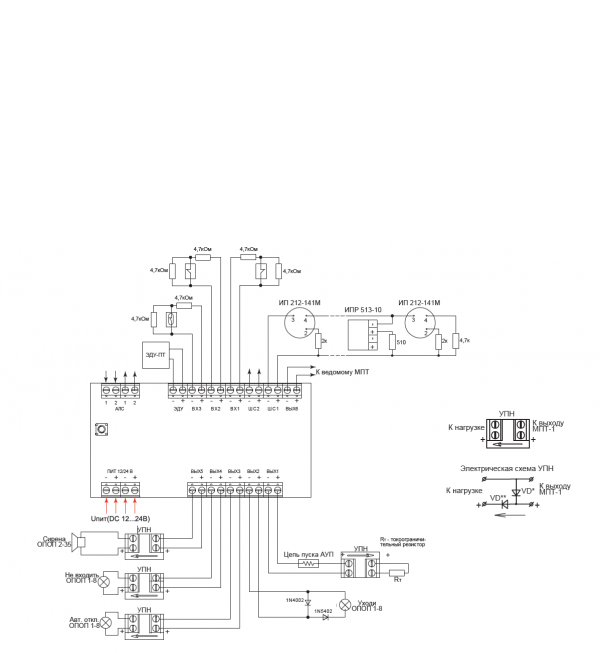 УПН представляет собой плату с установленными диодами, входным клеммником для подключения к линии от реле МПТ и выходным клеммником для подключения к нагрузке (исполнительному устройству).