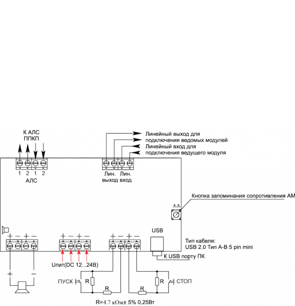 - два выхода для подключения кнопок ПУСК и СТОП с контролем целостности цепей на КЗ и обрыв для локального запуска и прекращения оповещения;