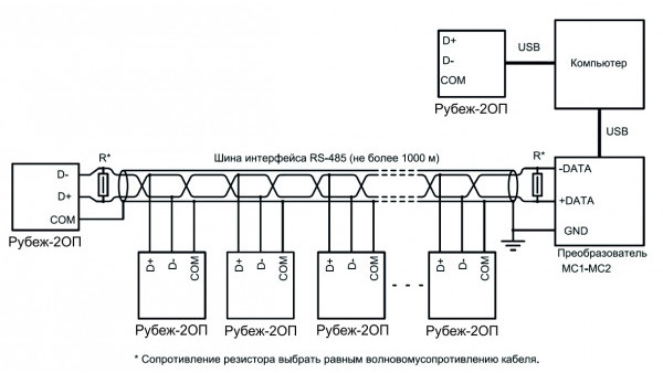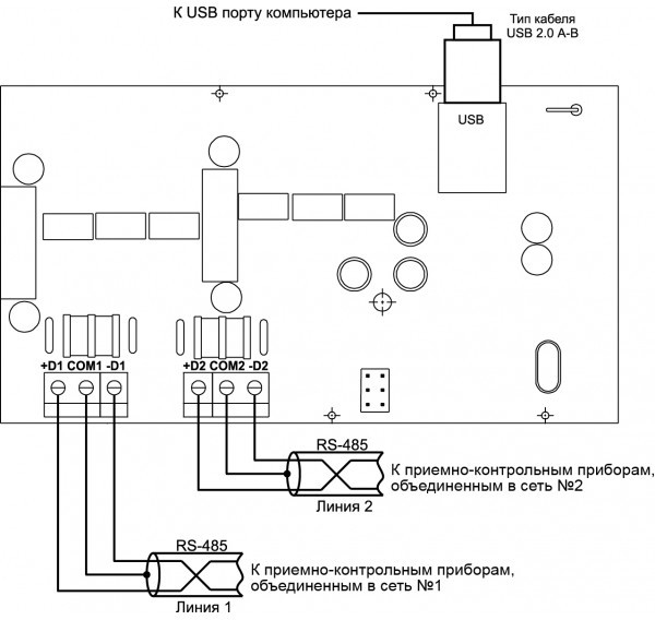 - подключение объединенных по интерфейсу RS-485 адресных приемно-контрольных приборов к USB порту компьютера для управления и мониторинга системы;
