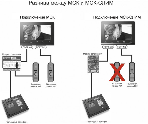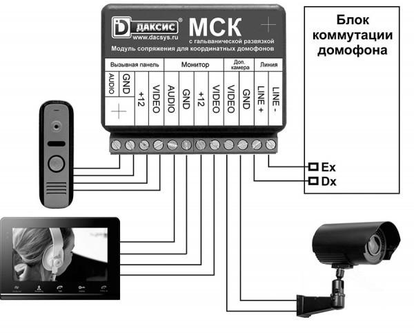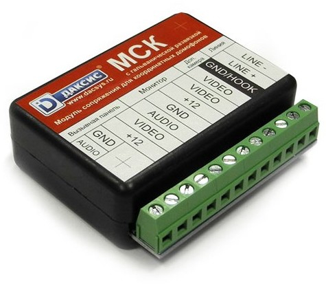 МСК - модуль сопряжения с гальванической развязкой индивидуального видеодомофона с общеподъездным многоквартирным домофоном предназначен для подключения индивидуального видеодомофона к линии связи общеподъездного домофона с координатной системой адресации абонентов (Визит, Цифрал, Элтис, Метаком выпуска после 2015г. и других аналогичных), для приема вызовов от него и открывания подъездной двери с помощью стандартных функций видеодомофона.