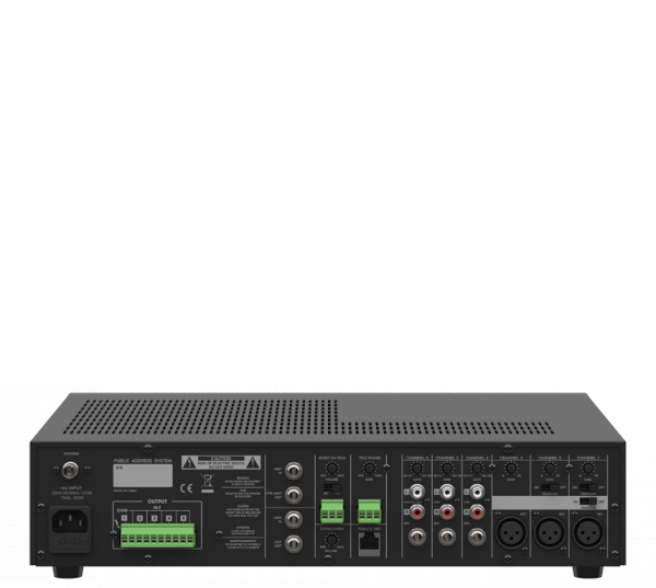 MX-480 - комбинированный трансляционный 5-зонный микшер - усилитель выходной мощностью 480 Вт встроенными: 7-полосным эквалайзером, проигрывателем MP3/WMA аудиофайлов, FM-тюнером, поддержкой внешних USB флеш накопителей и SD/SDHC карт (до 16 Гб), возможностью подключения (RJ-45) удалённой микрофонной консоли Roxton RM-05, наличием светодиодных индикаторов уровня выходного сигнала и срабатывания защиты, генератора сигнала (Сирена и ГОНГ) предназначен для микширования и усиления звукового сигнала с целью его дальнейшей трансляции на громкоговорители с питанием 100 В.