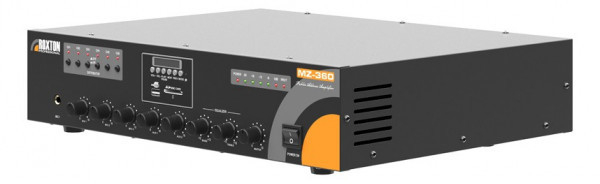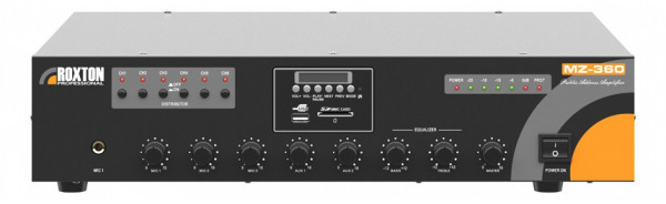 MZ-360 - трансляционный 6-зонный микшер - усилитель выходной мощностью 240 Вт встроенными: проигрывателем MP3/WMA аудиофайлов, FM-тюнером, поддержкой внешних USB флеш накопителей и SD/SDHC карт (до 16 Гб), наличием светодиодных индикаторов уровня выходного сигнала и срабатывания защиты, предназначен для микширования и усиления звукового сигнала с целью его дальнейшей трансляции на громкоговорители 4 Ом или с питанием 70/100 В.