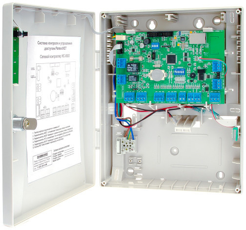 Parsec NC-8000 - cетевой (Ethernet и RS-485) контроллер доступа в пластиковом корпусе, с блоком питания и отсеком для АКБ (резервного питания), на 8000 пользователей, с креплением на стену.
