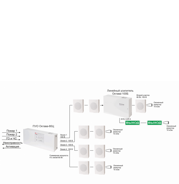 Октава 80Ц 100В - прибор-моноблок (центральный блок системы) представляет собой полноценную СОУЭ с резервированным блоком питания (АКБ - 2шт по 7Ач), собранную в одном корпусе, и предназначен для построения систем оповещения и управления эвакуацией 3 и 4 типов.