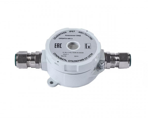 ОРБИТА МК З-Н-Б - оповещатель пожарный взрывозащищенный (1ExdIIBТ6Gb), звуковой (105 дБ), напряжением питания (12 - 30 В), степенью защиты (IP67), с 2-мя кабельными вводами для прокладки бронированного кабеля диаметром (6,5 - 13,9мм -внутренний; 12,5 - 20,9 - наружный) и заглушкой (всё в комплектации) предназначен для подачи звукового сигнала в системах пожарной и охранной сигнализации при совместной работе с любыми приемно-контрольными устройствами и применяется на предприятиях химической, нефтегазодобывающей, нефтегазоперерабатывающей отраслей и взрывоопасных зонах других производств.