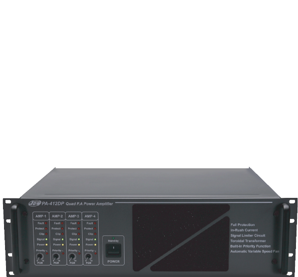 PA-412DP - трансляционный настольный и встраиваемый в 19" стойку/шкаф 4-зонный усилитель выходной мощностью 120 Вт (на каждый канал), встроенным вентилятором охлаждения предназначен для усиления звукового сигнала с целью его дальнейшей трансляции на громкоговорители с питанием 25/50/100 В.