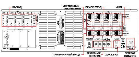 В устройстве предусмотрены: приоритетный вход аудиосигнала (4 шт.) и приоритетное реле (4 шт.).