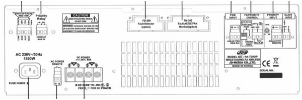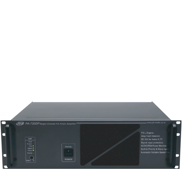 PA-720DP - трансляционный настольный и встраиваемый в 19" стойку/шкаф 1-зонный усилитель выходной мощностью 720 Вт, встроенным вентилятором охлаждения предназначен для усиления звукового сигнала с целью его дальнейшей трансляции на громкоговорители с питанием 50/70/100 В.