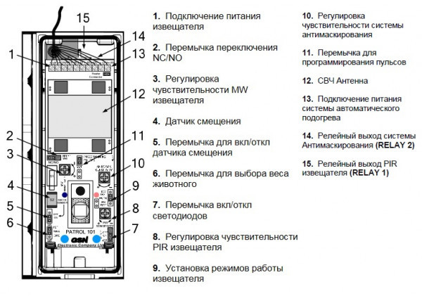PATROL-101PET - извещатель охранный однопозиционный в составе блока - приёмопередатчика, комбинированный: оптико-электронный поверхностный (ИК) активный с "QUAD" пироэлементом и радиоволновый объёмный (РВ) предназначен для обнаружения проникновения в охраняемое закрытое пространство и формирование извещения о тревоге путем размыкания/замыкания (2 НЗ/2 НО) раздельных 2-ух (тревога и маскирование) выходных контактов оптоэлектронных реле.