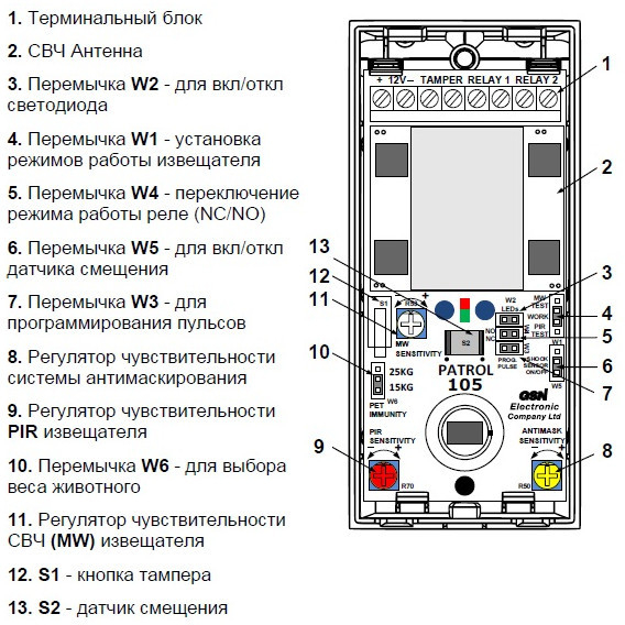 PATROL-105PET - извещатель охранный объемный комбинированный: оптико-электронный (ИК) пассивный с двойным пироэлементом и радиоволновый (СВЧ - на эффекте Доплера) предназначен для обнаружения проникновения в охраняемое закрытое пространство и формирование извещения о тревоге путем размыкания (НЗ) раздельных 2-ух (тревога и маскирование) выходных контактов оптоэлектронных реле.