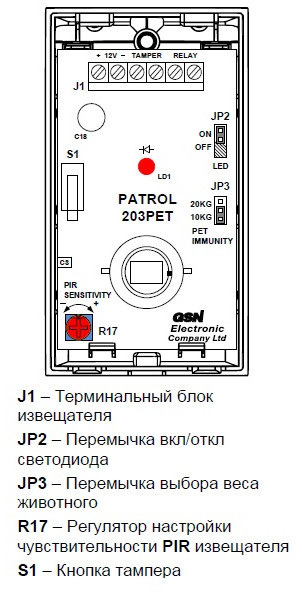 PATROL-203PET - извещатель охранный объемный оптико-электронный пассивный с двойным пироэлементом предназначен для обнаружения проникновения в охраняемое закрытое пространство и формирование извещения о тревоге путем размыкания (НЗ) выходных контактов оптоэлектронного реле.