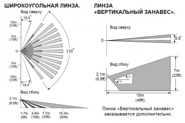 - объёмная (ИК) и поверхностная (АК) зоны обнаружения (линза - "широкоугольная");