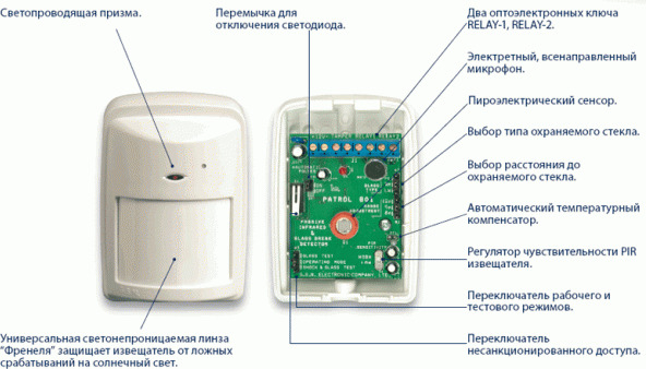 PATROL-801 - извещатель охранный совмещённый: объёмный - оптико-электронный (ИК) пассивный с пироэлементом и звуковой (АК) предназначен для обнаружения проникновения в охраняемое закрытое пространство, а также разрушения остеклённых конструкций (в т. ч. стеклопакетов) и формирование извещения о тревоге путем размыкания (НЗ) раздельных 2-ух выходных контактов оптоэлектронных реле.