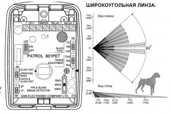 PATROL-801 PET - извещатель охранный совмещённый: объёмный - оптико-электронный (ИК) пассивный с пироэлементом и звуковой (АК) предназначен для обнаружения проникновения в охраняемое закрытое пространство, а также разрушения остеклённых конструкций (в т. ч. стеклопакетов) и формирование извещения о тревоге путем размыкания (НЗ) раздельных 2-ух выходных контактов оптоэлектронных реле.