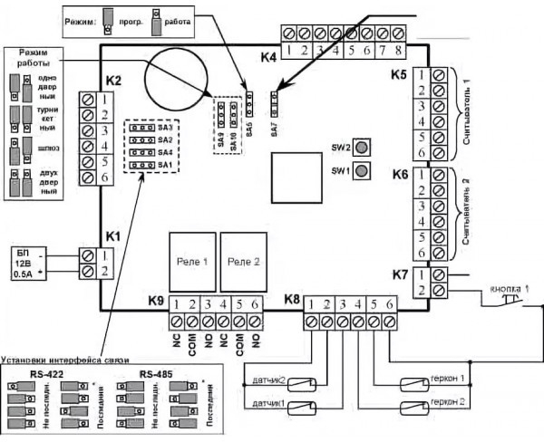 Контроллер подключается по интерфейсу RS-485 к контроллеру замка/турникета CT/L04 или к электронным проходным KT02, KT05, KTC01, KR05 (возможно подключение до 8-ми контроллеров CL201.1).